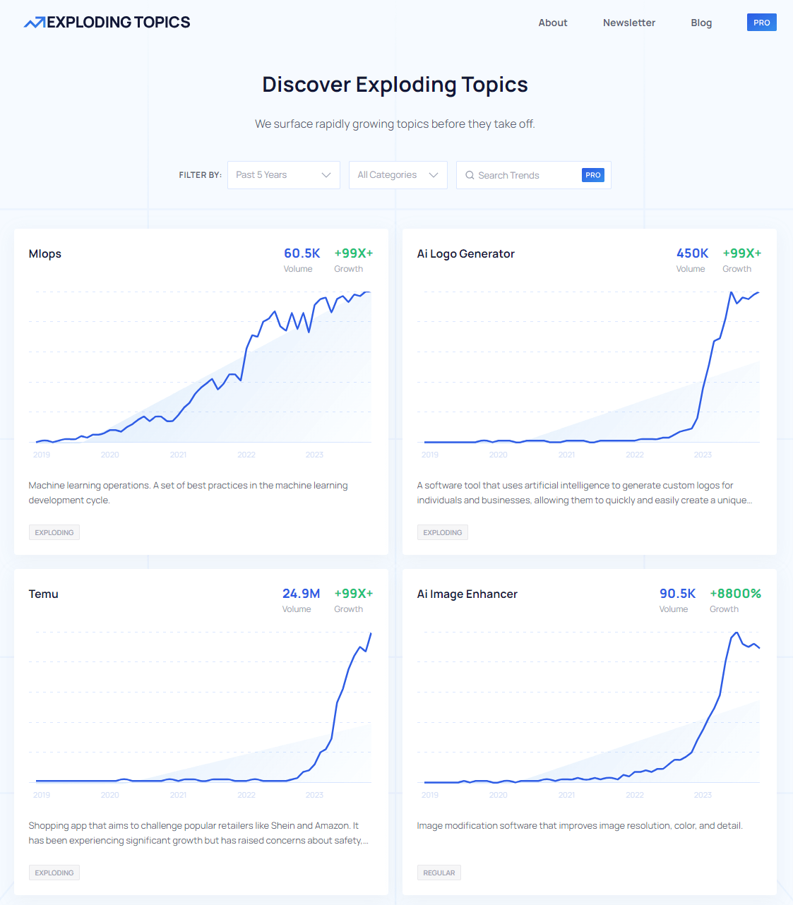 Exploding Topics allow users to find historical data from three months to 15 years time – giving an insight to identifying seasonal trends or anomalies that are worth noting.