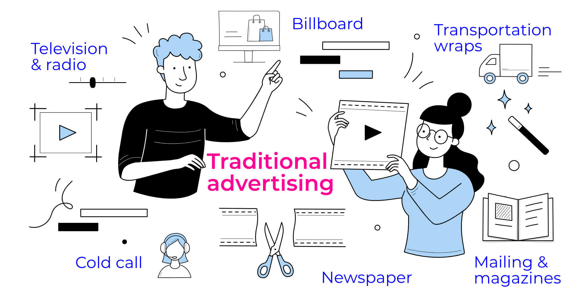Traditional advertising is a form of advertisement that exists outside the realm of the Internet. This is what we refer to as “old school” forms of advertising that our parents or even grandparents are highly familiar with.