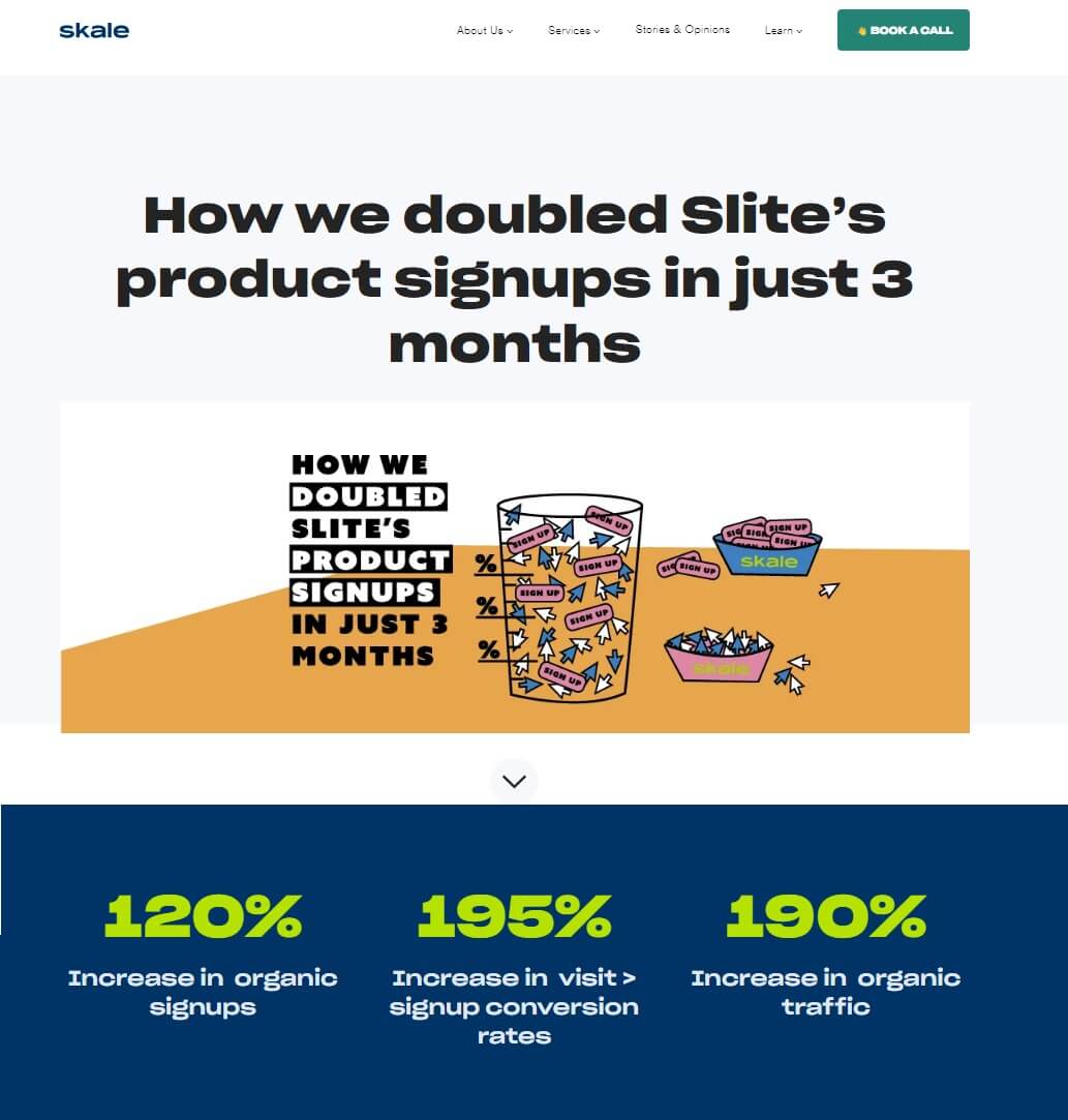 Skale worked on an extensive SEO campaign for one of their clients, Slite to turn SEO into a conversion-driven channel. Some of the key strategies they implemented were improving Slite’s website architecture, building quality backlinks and running numerous A/B tests to increase the conversion metrics – signups. After just three months, Slite had doubled their signups and the conversion rate increased by up to 195%.